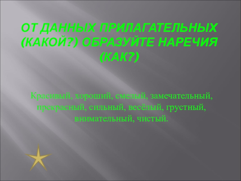 ОТ ДАННЫХ ПРИЛАГАТЕЛЬНЫХ (КАКОЙ?) ОБРАЗУЙТЕ НАРЕЧИЯ (КАК?)Красивый, хороший, смелый, замечательный, прекрасный, сильный, весёлый, грустный, внимательный, чистый.