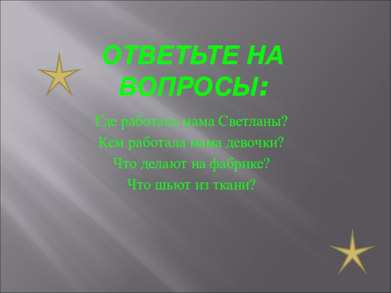 ОТВЕТЬТЕ НА ВОПРОСЫ:Где работала мама Светланы?Кем работала мама девочки?Что делают на фабрике?Что шьют из ткани?