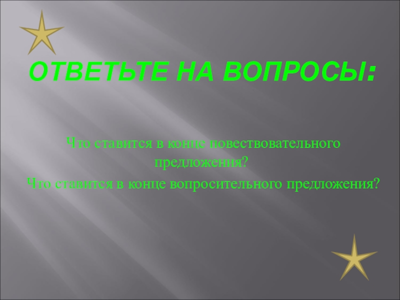 ОТВЕТЬТЕ НА ВОПРОСЫ: Что ставится в конце повествовательного предложения?Что ставится в конце вопросительного предложения?