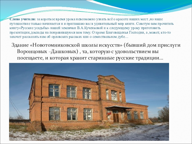 Здание «Новотомниковской школы искусств» (бывший дом прислуги Воронцовых –Дашковых) , та, которую с удовольствием вы посещаете, и которая хранит старинные русские традиции…