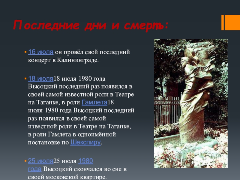 июля18 июля 1980 года Высоцкий последний раз появился в своей самой известной роли в Театре на Таганке, в роли Гамлета18 июля 1980 года Высоцкий последний раз появился в своей самой известной роли в Театре на Таганке, в роли Гамлета в одноимённой постановке по Шекспиру.