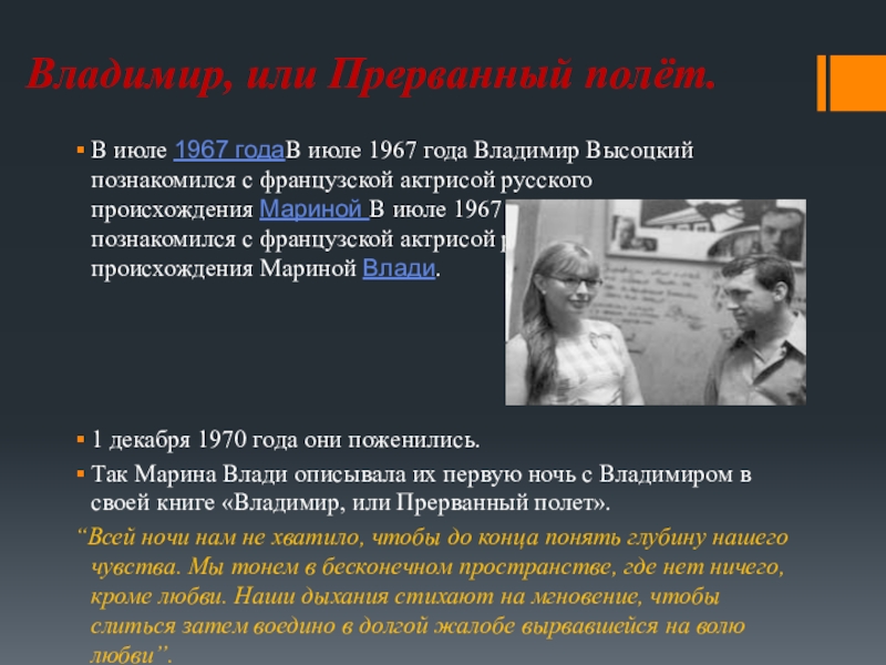 русского происхождения Мариной В июле 1967 года Владимир Высоцкий познакомился с французской актрисой русского происхождения Мариной Влади.