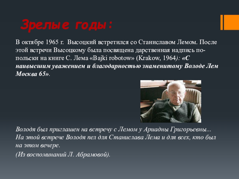 встречи Высоцкому была посвящена дарственная надпись по-польски на книге С. Лема «Bajki robotow» (Krakow, 1964): «С наивысшим уважением и благодарностью знаменитому Володе Лем Москва 65».