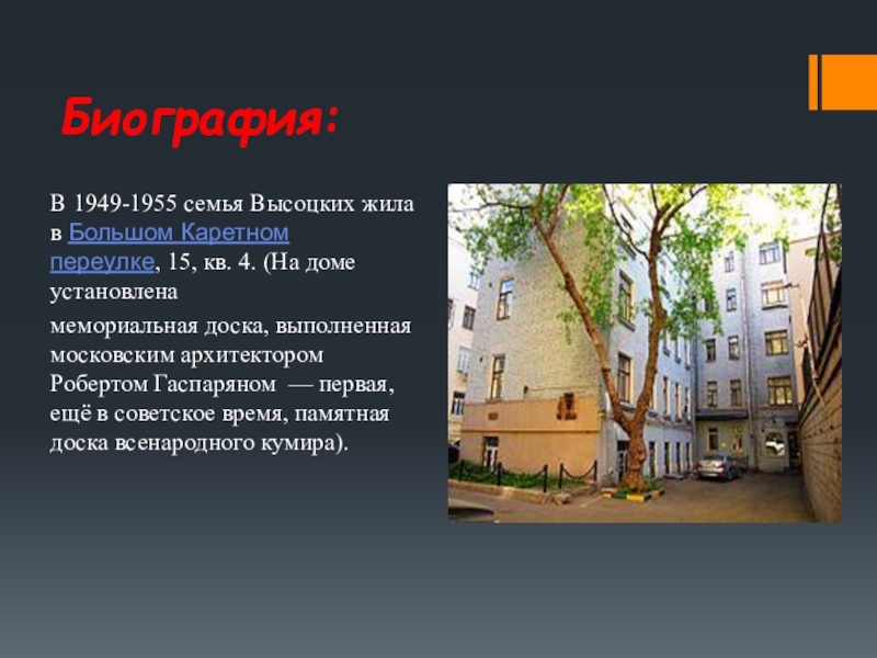 В 1949-1955 семья Высоцких жила в Большом Каретном переулке, 15, кв. 4. (На доме