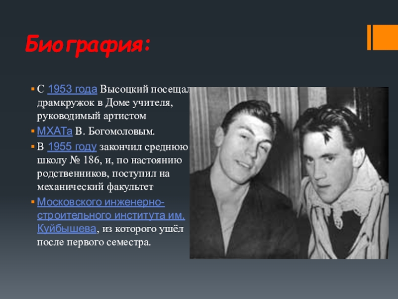 С 1953 года Высоцкий посещал драмкружок в Доме учителя, руководимый артистом