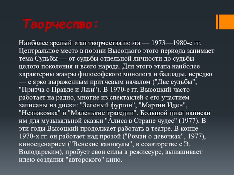 поэзии Высоцкого этого периода занимает тема Судьбы — от судьбы отдельной личности до судьбы целого поколения и всего народа. Для этого этапа наиболее характерны жанры философского монолога и баллады, нередко — с ярко выраженным притчевым началом ("Две судьбы", "Притча о Правде и Лжи"). В 1970-е гг. Высоцкий часто работает на радио, многие из спектаклей с его участием записаны на диски: "Зеленый фургон", "Мартин Иден", "Незнакомка" и "Маленькие трагедии". Большой цикл написан им для музыкальной сказки "Алиса в Стране чудес" (1977). В эти годы Высоцкий продолжает работать в театре. В конце 1970-х гг. он работает над прозой ("Роман о девочках", 1977), киносценарием ("Венские каникулы", в соавторстве с Э. Володарским), пробует свои силы в режиссуре, вынашивает идею создания "авторского" кино.