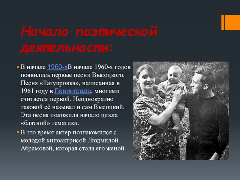 В начале 1960-хВ начале 1960-х годов появились первые песни Высоцкого. Песня «Татуировка»,