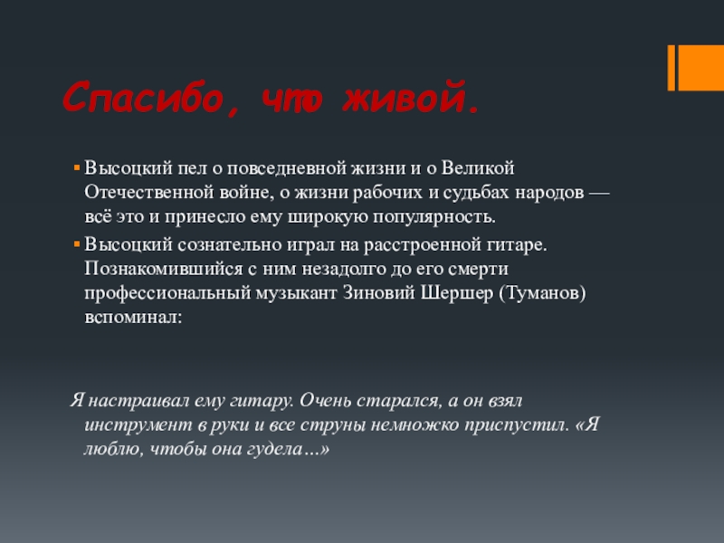 Высоцкий сознательно играл на расстроенной гитаре. Познакомившийся с ним незадолго до его смерти профессиональный музыкант Зиновий Шершер (Туманов) вспоминал: