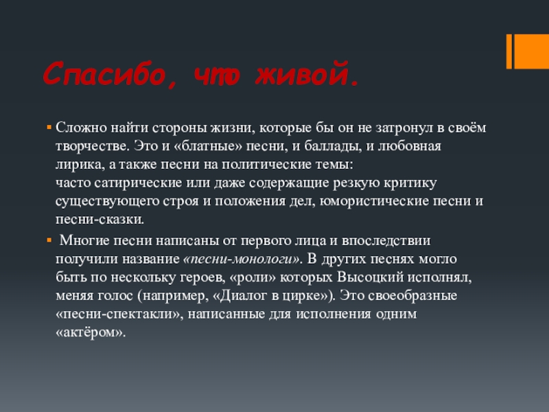 в своём творчестве. Это и «блатные» песни, и баллады, и любовная лирика, а также песни на политические темы: часто сатирические или даже содержащие резкую критику существующего строя и положения дел, юмористические песни и песни-сказки.