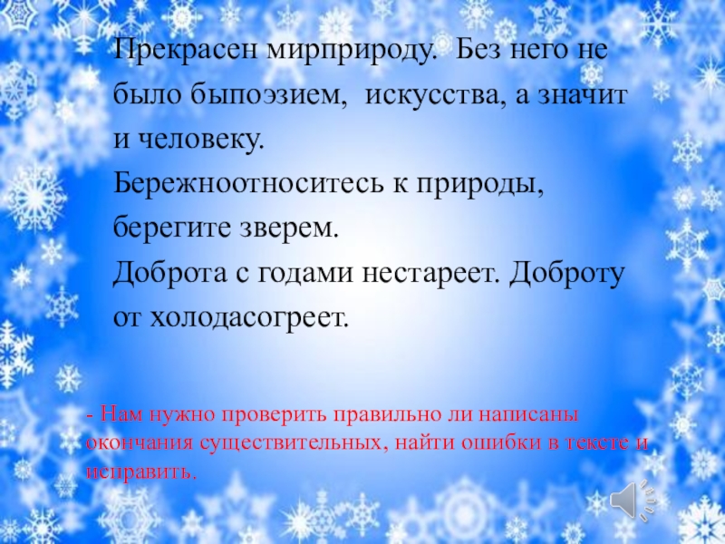 - Нам нужно проверить правильно ли написаны окончания существительных, найти ошибки в тексте и исправить.