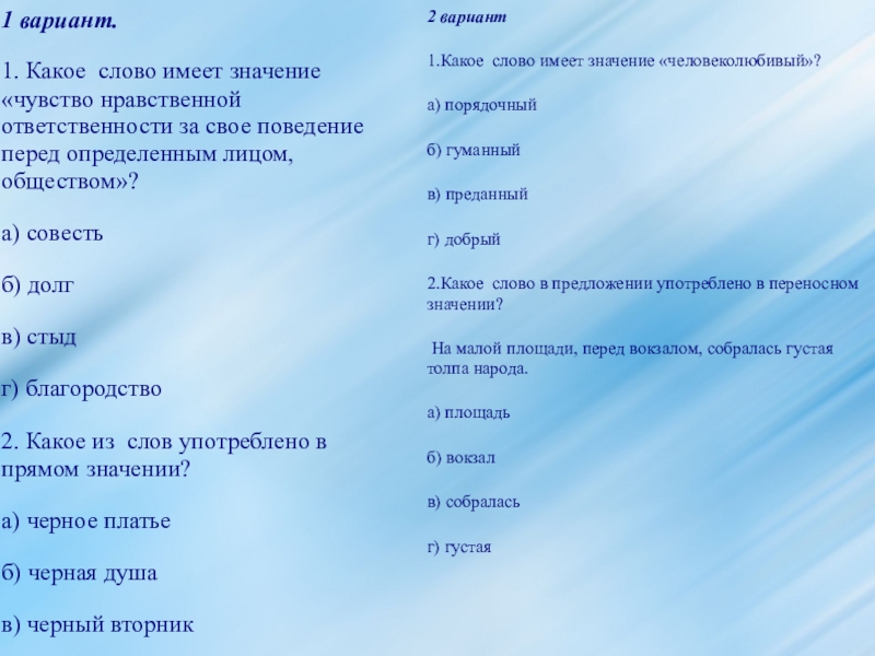1.Какое слово имеет значение «человеколюбивый»?