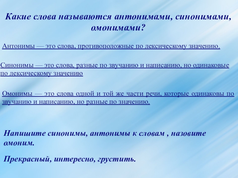 Напишите синонимы, антонимы к словам , назовите омоним.
