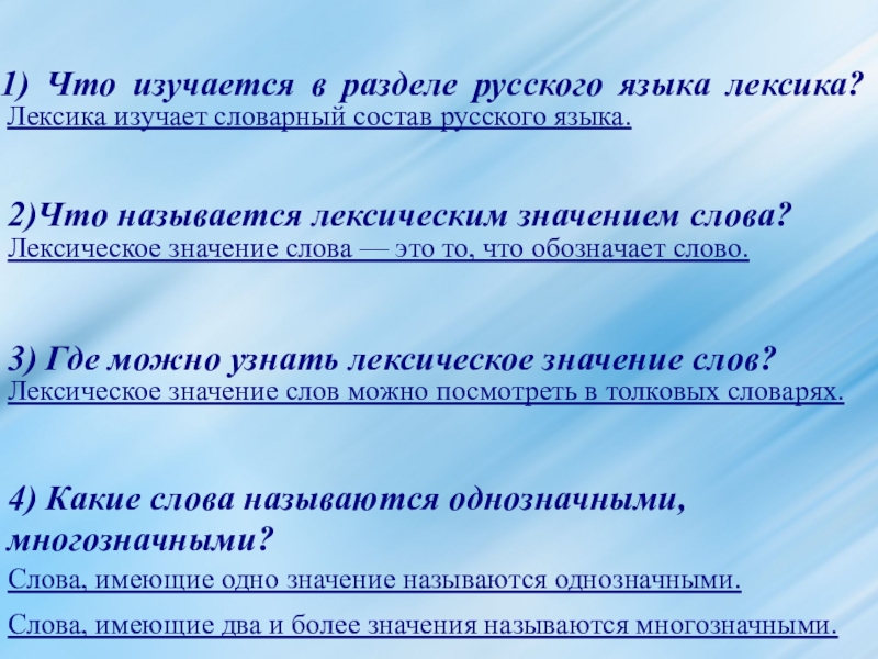 3) Где можно узнать лексическое значение слов?