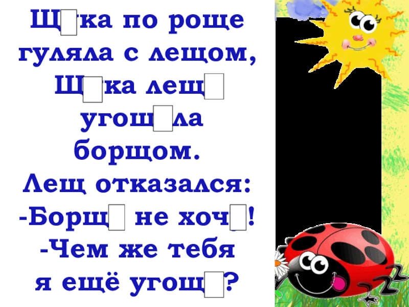 Щука по роще гуляла с лещом,Щука леща угощала борщом.Лещ отказался:-Борща не хочу!-Чем же тебя я ещё