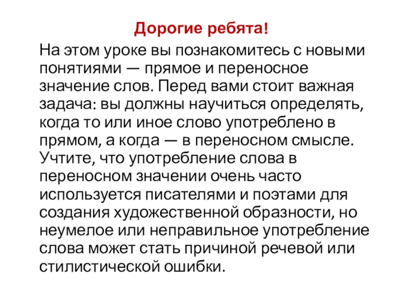 понятиями — прямое и переносное значение слов. Перед вами стоит важная задача: вы должны научиться определять, когда то или иное слово употреблено в прямом, а когда — в переносном смысле. Учтите, что употребление слова в переносном значении очень часто используется писателями и поэтами для создания художественной образности, но неумелое или неправильное употребление слова может стать причиной речевой или стилистической ошибки.