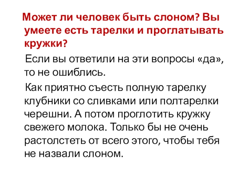 Слайд 3 Может ли человек быть слоном? Вы умеете есть тарелки