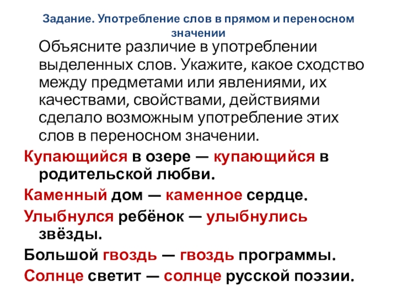 Слайд 20Задание. Употребление слов в прямом и переносном значении