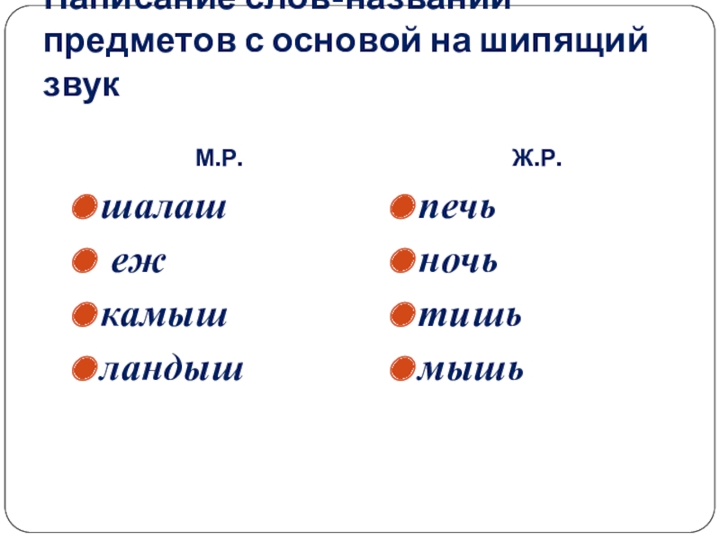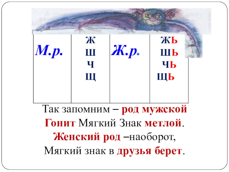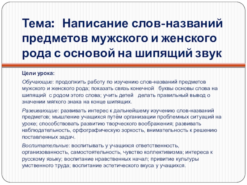 Обучающие: продолжить работу по изучению слов-названий предметов мужского и женского рода; показать связь конечной буквы основы слова на шипящий с родом этого слова; учить детей делать правильный вывод о значении мягкого знака на конце шипящих.
