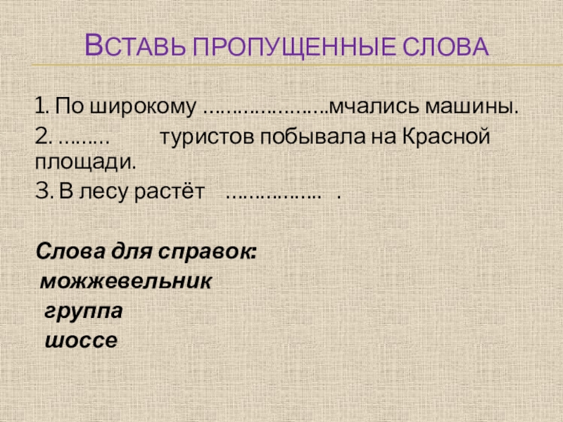 Вставь пропущенные слова1. По широкому ………………….мчались машины. 2. ………     туристов побывала на Красной