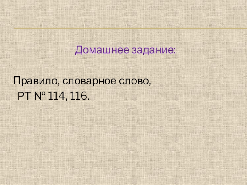 Домашнее задание: Правило, словарное слово,  РТ № 114, 116.