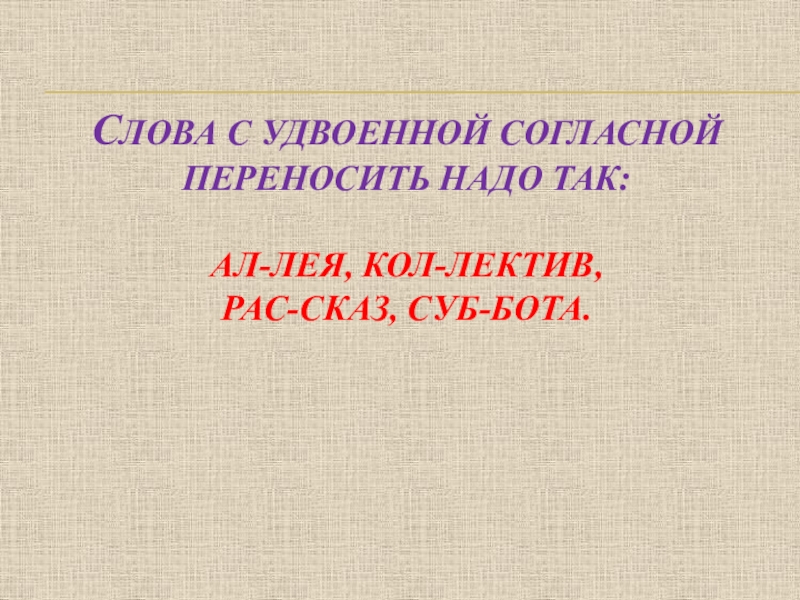 Слайд 7 Слова с удвоенной согласной переносить надо так: ал-лея, кол-лектив, рас-сказ, суб-бота.