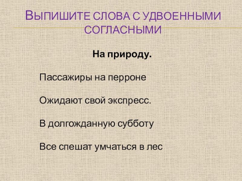 Выпишите слова с удвоенными согласными  На природу. Пассажиры на перроне Ожидают свой экспресс. В долгожданную субботу Все спешат умчаться в