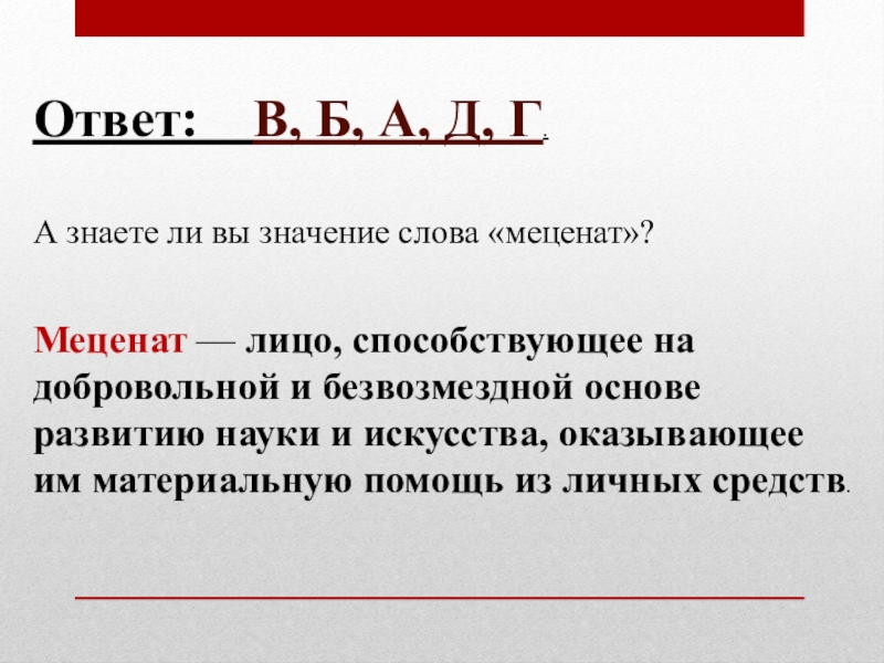 Меценат — лицо, способствующее на добровольной и безвозмездной основе развитию науки и искусства, оказывающее им материальную помощь из личных средств.