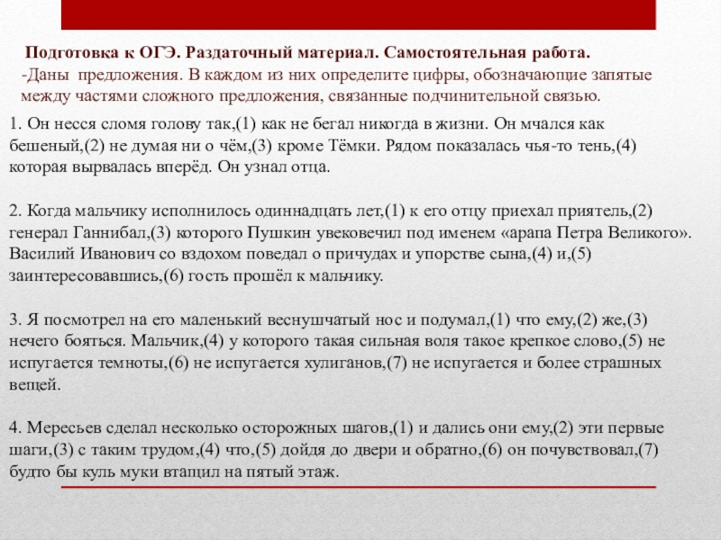 1. Он несся сломя голову так,(1) как не бегал никогда в жизни. Он мчался как бешеный,(2) не думая ни о чём,(3) кроме Тёмки. Рядом показалась чья-то тень,(4) которая вырвалась вперёд. Он узнал отца.