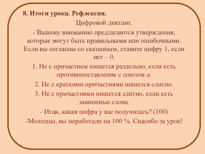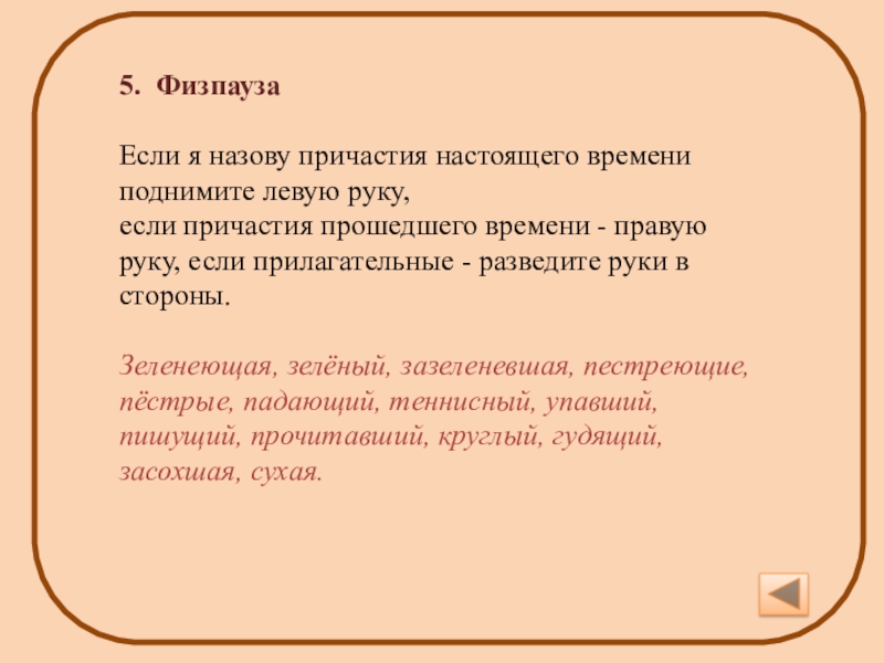 если причастия прошедшего времени - правую руку, если прилагательные - разведите руки в стороны.
