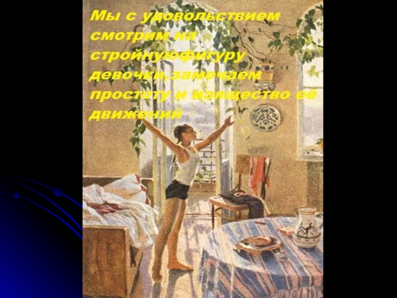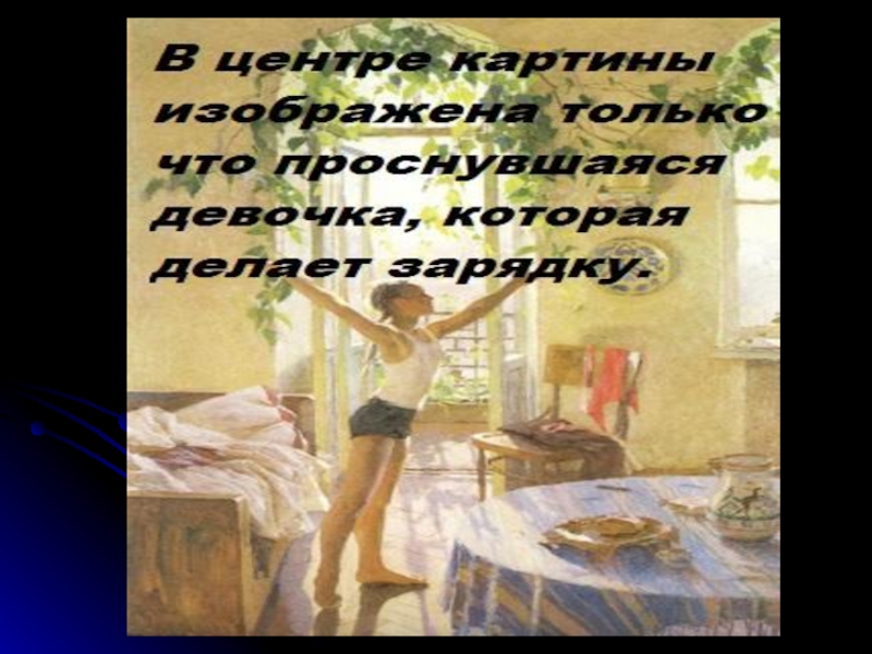 За балконом, в легкой туманной дымке виднеются высокие здания. Это город. Звуки, запахи и ритмы утреннего города заполняют комнату. Зеленые растения на балконе показывают, что зимы нет. Скорее всего, это весна.