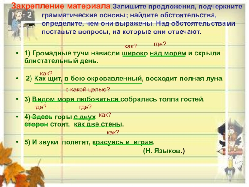 1) Громадные тучи нависли широко над морем и скрыли блистательный день.