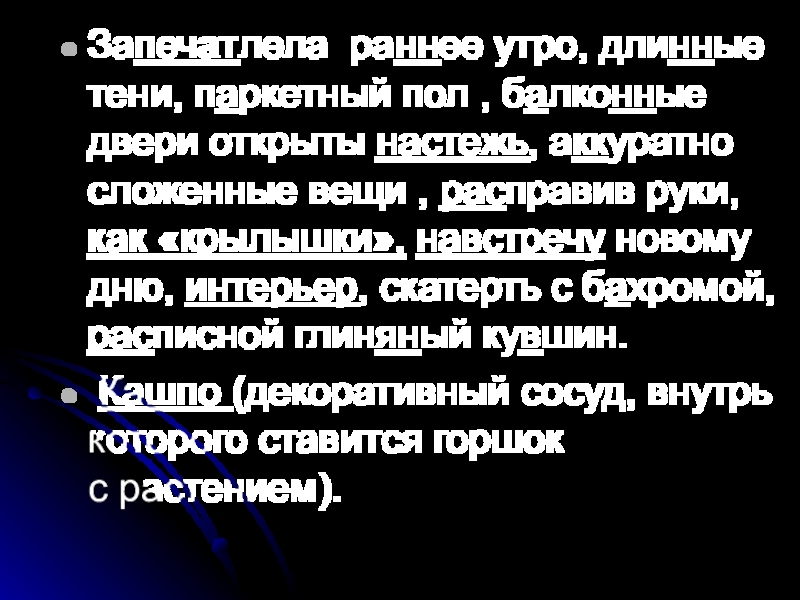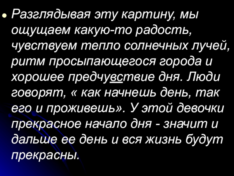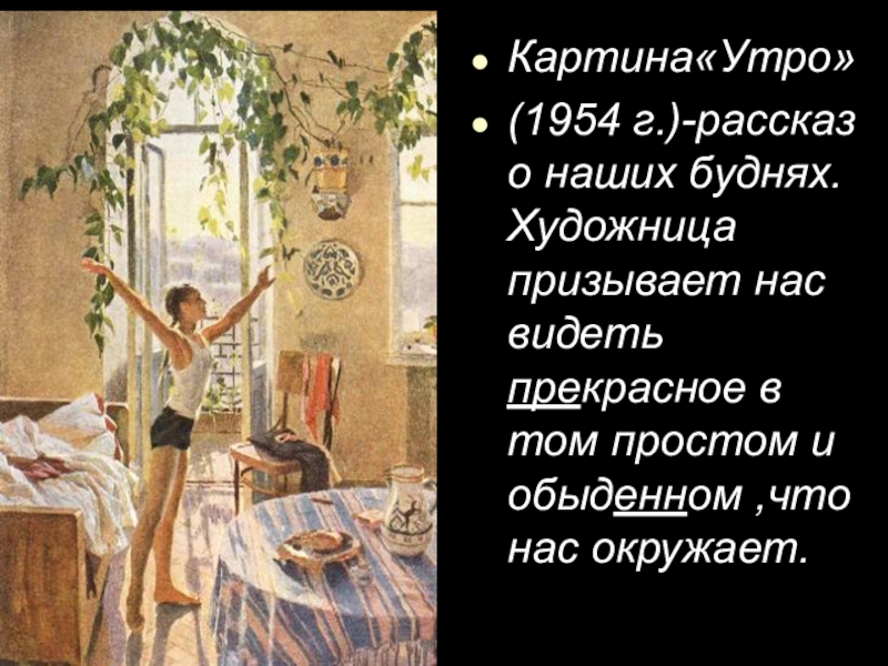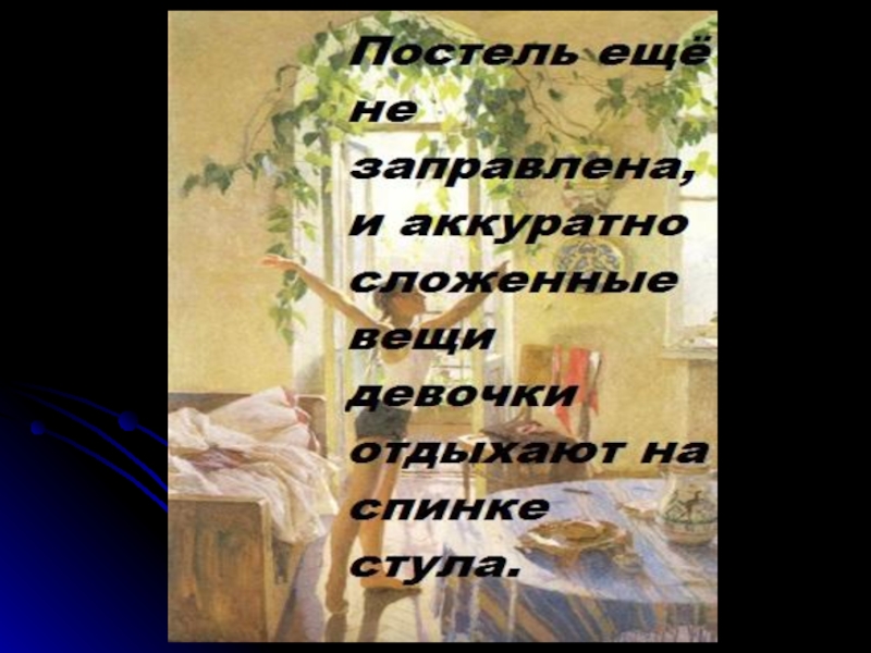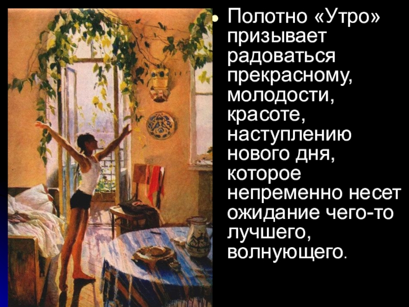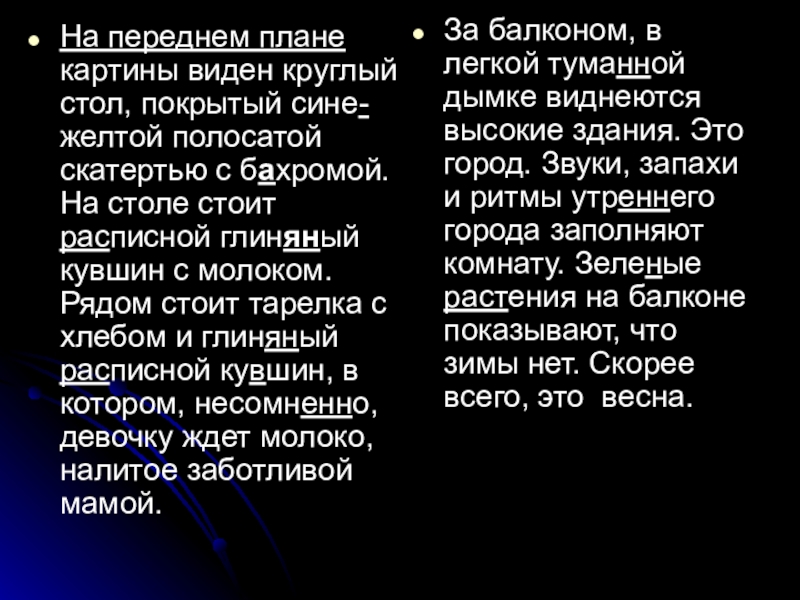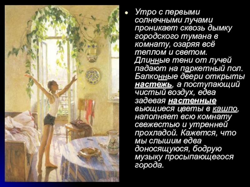 За балконом, в легкой туманной дымке виднеются высокие здания. Это город. Звуки, запахи и ритмы утреннего города заполняют комнату. Зеленые растения на балконе показывают, что зимы нет. Скорее всего, это весна.