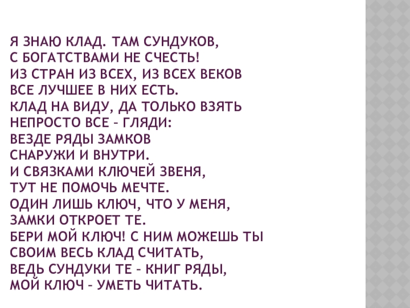 Я знаю клад. Там сундуков, С богатствами не счесть! Из стран из всех, из всех веков Все лучшее в них есть. Клад на виду, да только взять Непросто все – гляди: Везде ряды замков Снаружи и