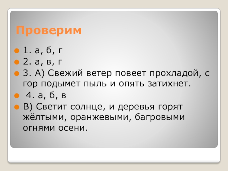в) Светит солнце и деревья горят желтыми оранжевыми багровыми огнями осени.