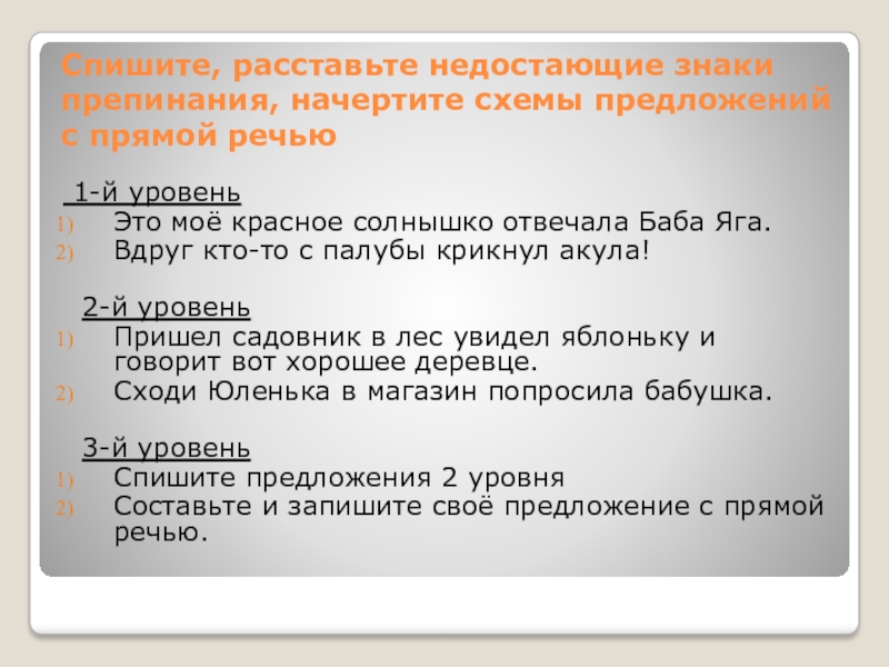Слайд 15Спишите, расставьте недостающие знаки препинания, начертите схемы предложений с прямой речью