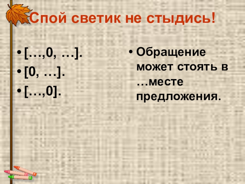 Спой светик не стыдись![…,0, …].[0, …].[…,0].Обращение может стоять в …месте предложения.