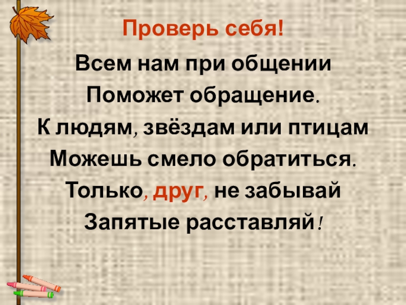 Проверь себя!Всем нам при общенииПоможет обращение.К людям, звёздам или птицамМожешь смело обратиться.Только, друг, не забывайЗапятые расставляй!