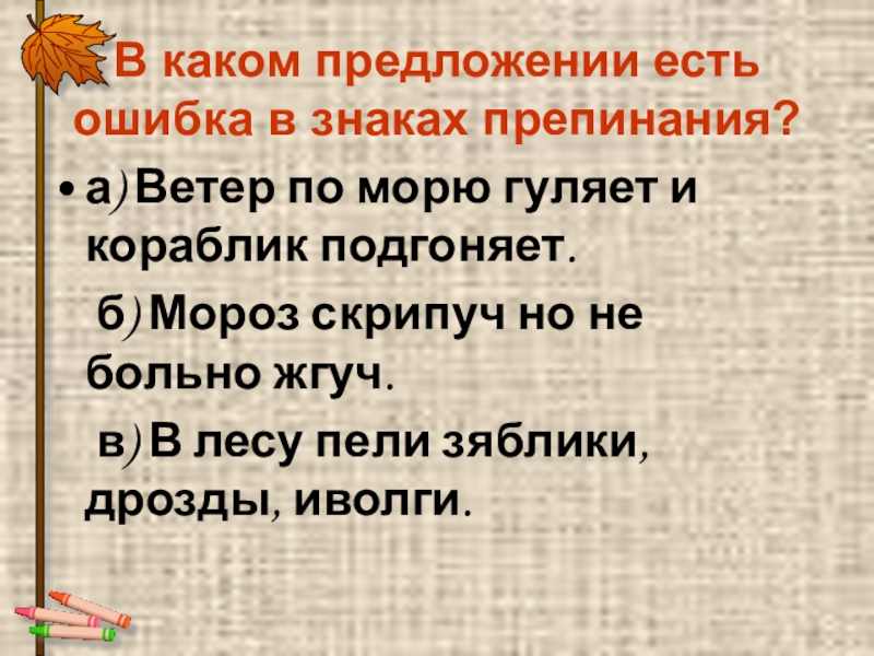 В каком предложении есть ошибка в знаках препинания?а) Ветер по морю гуляет и кораблик подгоняет.	б) Мороз скрипуч