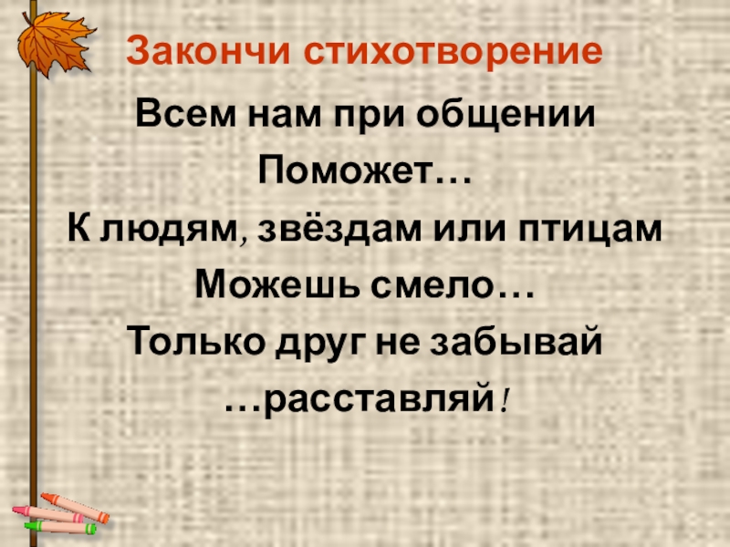 Закончи стихотворениеВсем нам при общенииПоможет…К людям, звёздам или птицамМожешь смело…Только друг не забывай…расставляй!