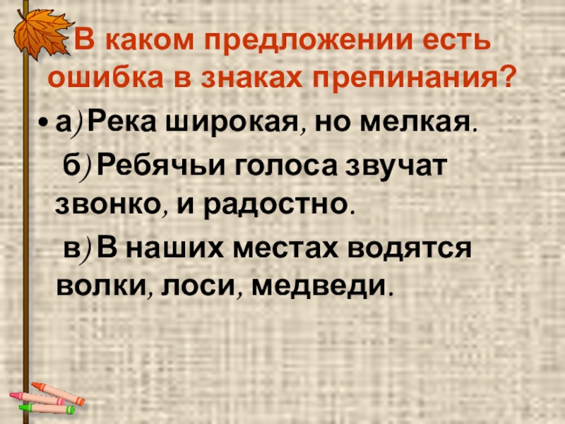 В каком предложении есть ошибка в знаках препинания?а) Река широкая, но мелкая.		б) Ребячьи голоса звучат звонко, и