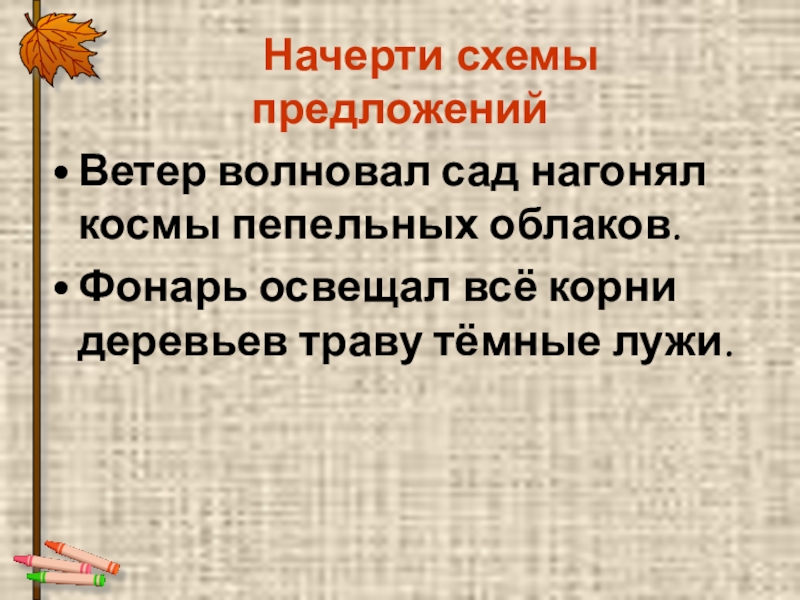 Начерти схемы предложенийВетер волновал сад нагонял космы пепельных облаков.Фонарь освещал всё корни деревьев траву