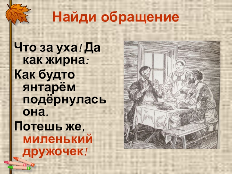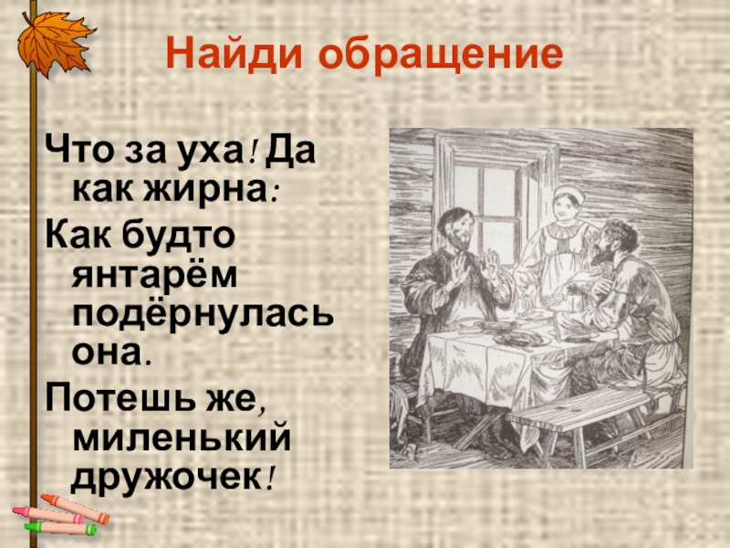 Найди обращениеЧто за уха! Да как жирна:Как будто янтарём подёрнулась она.Потешь же, миленький дружочек!