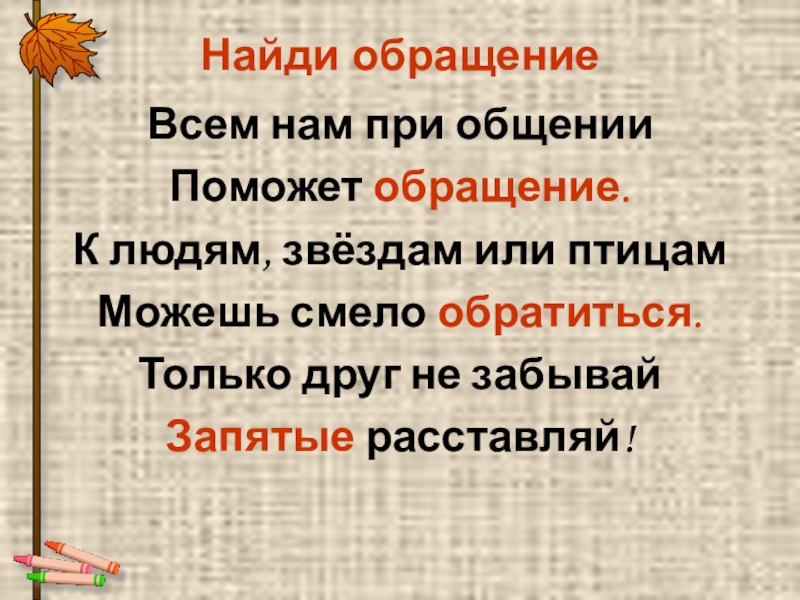 Найди обращениеВсем нам при общенииПоможет обращение.К людям, звёздам или птицамМожешь смело обратиться.Только друг не забывайЗапятые расставляй!