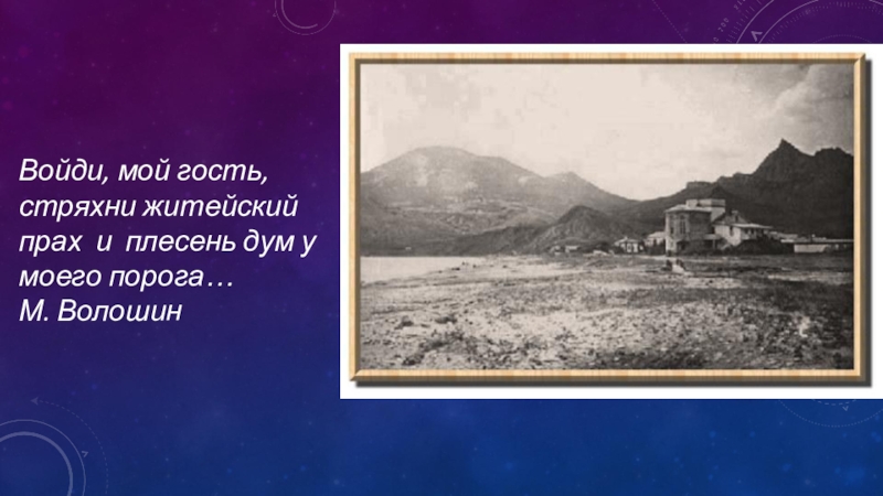 Войди, мой гость, стряхни житейский прах и плесень дум у моего порога…М. Волошин