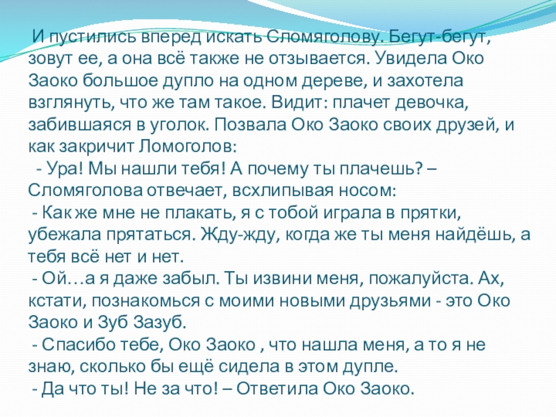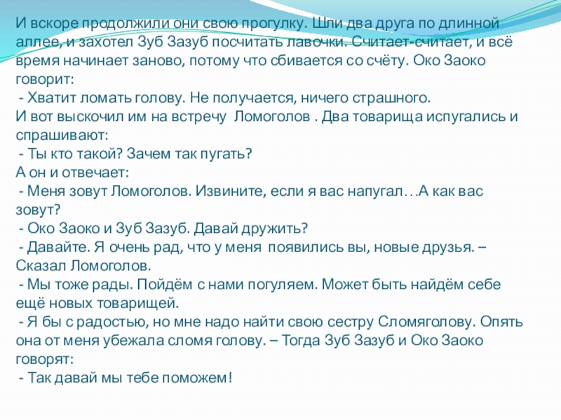 - Я бы с радостью, но мне надо найти свою сестру Сломяголову. Опять она от меня убежала сломя голову. – Тогда Зуб Зазуб и Око Заоко говорят: