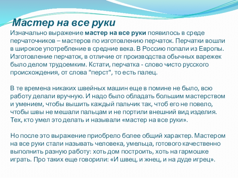 Но после это выражение приобрело более общий характер. Мастером на все руки стали называть человека, умельца, готового качественно выполнить разную работу: хоть дом построить, хоть на гармошке играть. Про таких еще говорили: «И швец, и жнец, и на дуде игрец».