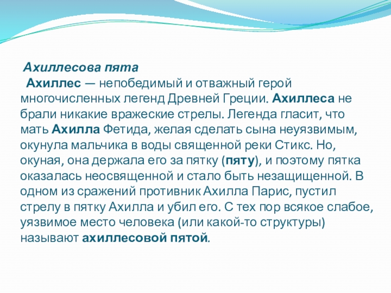 Греции. Ахиллеса не брали никакие вражеские стрелы. Легенда гласит, что мать Ахилла Фетида, желая сделать сына неуязвимым, окунула мальчика в воды священной реки Стикс. Но, окуная, она держала его за пятку (пяту), и поэтому пятка оказалась неосвященной и стало быть незащищенной. В одном из сражений противник Ахилла Парис, пустил стрелу в пятку Ахилла и убил его. С тех пор всякое слабое, уязвимое место человека (или какой-то структуры) называют ахиллесовой пятой.