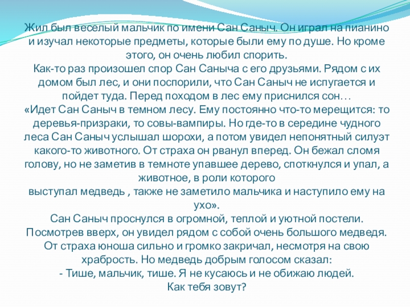 Жил был веселый мальчик по имени Сан Саныч. Он играл на