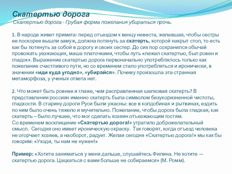 2. Что может быть ровнее и глаже, чем расправленная шелковая скатерть? В представлении россиян именно скатерть была символом безукоризненной чистоты, гладкости. В старину дороги Руси были ужасны: все в колдобинах и рытвинах, ездить по ним было очень тяжело и мучительно. Пожелание, чтобы дорога была гладкая, как скатерть – было лучшее, что мог сделать хозяин отъезжающим гостям.