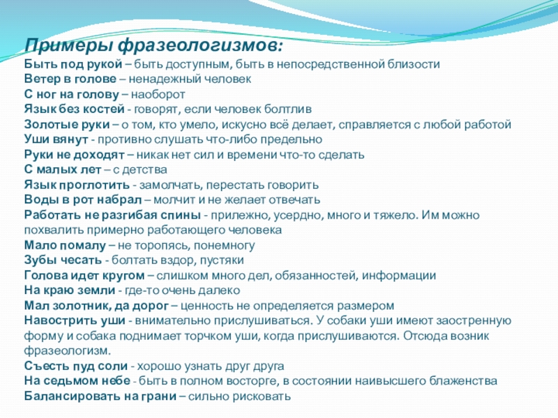 Примеры: Как в воду глядел; мастер на все руки; бить баклуши; дать сдачи и т.д.